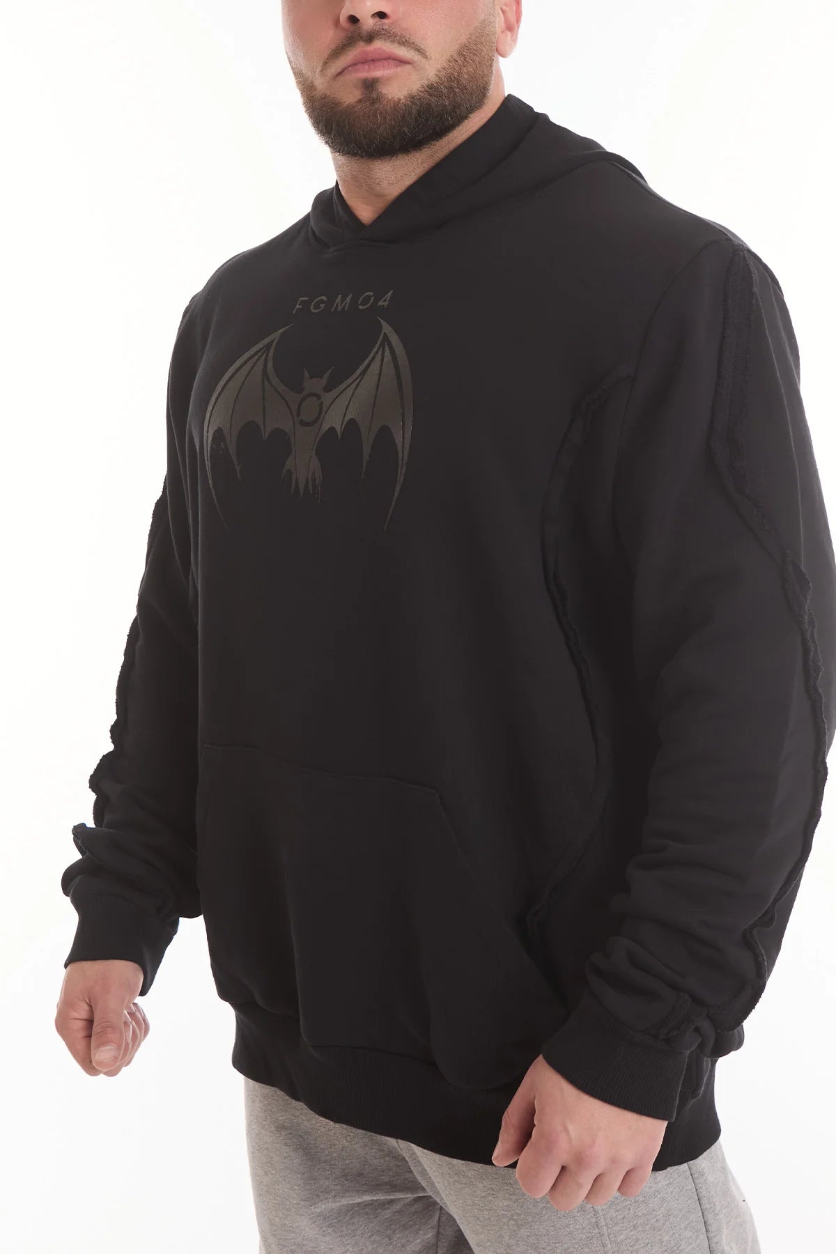 Sul fronte domina il pipistrello personalizzato FGM04, in stampa nero su nero, intensa e discreta allo stesso tempo: un simbolo che si rivela alla luce e definisce l’identità del capo.